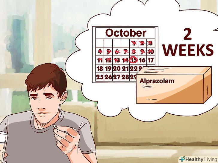 Дізнайтеся, як довго можуть тривати симптоми абстинентного синдрому.симптоми абстинентного синдрому після відмови від алпразоламу виникають приблизно через шість годин після прийому останньої дози. Пік симптомів, як правило, виникає між 24 і 72 годинами. Симптоми можуть тривати від двох до чотирьох тижнів.[10]- Пам'ятайте, поки ви успішно не завершите зменшувати дозу прийому бензодіазепіну, ваш організм буде постійно перебувати в легкій формі абстинентного синдрому. Саме тому настійно рекомендований повільна відмова від препарату.