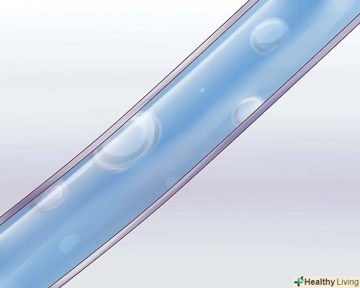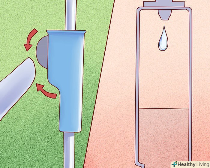 Позбавтеся від бульбашок в системі.крапельна камера повинна бути заповнена наполовину. Налаштуйте крапельницю так, щоб рідина дійшла до кінця трубки (це потрібно для того, щоб там не залишилося бульбашок). Коли рідина пройде всю трубку, затисніть кінець.