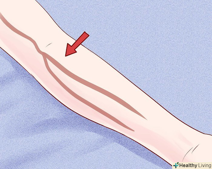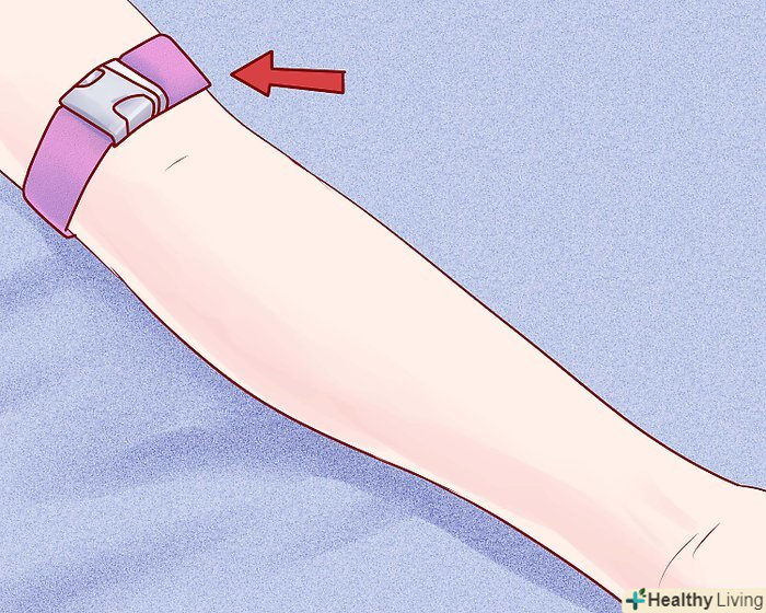 Перев'яжіть руку джгутом над майбутнім місцем проколу.[10] робіть це так, щоб вам потім було просто його зняти. Вена буде перетиснута, через що вона почне виступати над шкірою, і в неї буде легше потрапити.