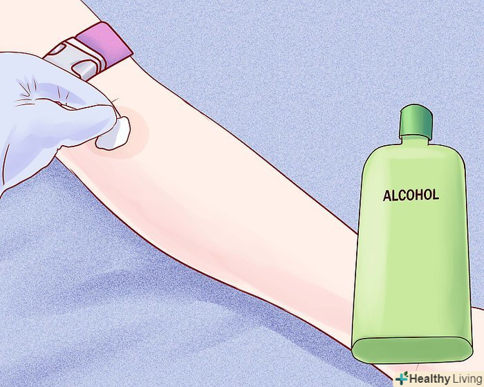 Простерилизуйте місце уколу.протріть шкіру ватою, змоченою в спирті (в тому місці, куди будете вставляти голку). Тріть цю ділянку круговими рухами, щоб позбутися від максимальної кількості мікроорганізмів. Дайте шкірі висохнути.[11]