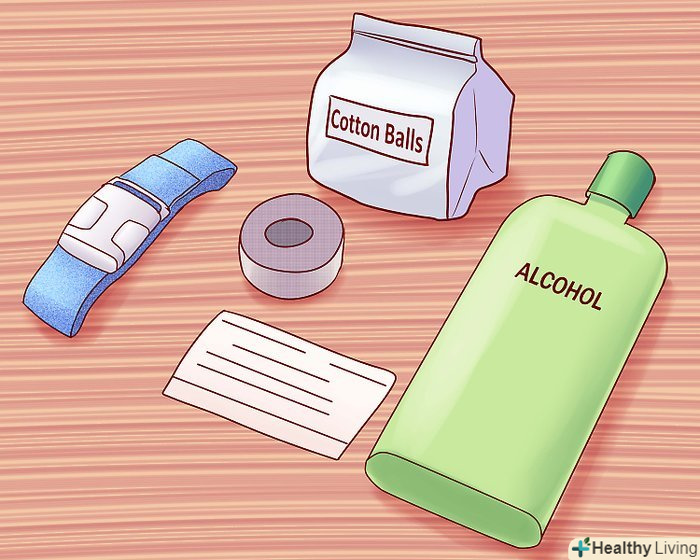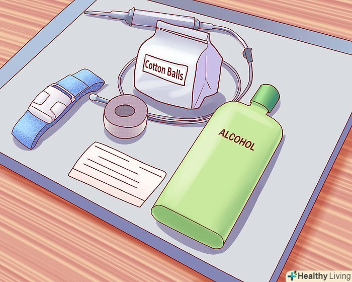 Підготуйте всі інші інструменти.[4] вам буде потрібно джгут (щоб знайти вену), пластир або медичний клей (щоб зафіксувати крапельницю в місці проколу вени), вата і спирт (для стерилізації предметів), наклейки (щоб зафіксувати час початку процедури, тип рідини і своє ім'я).