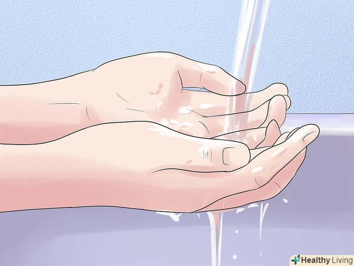 Помийте руки.відкрийте кран, намильте руки. Спочатку помийте долоні, а потім їх тильну сторону. Не забудьте помити ділянки між пальцями. Потім потрібно ретельно вимити пальці і зап'ястя. В кінці змийте мило і промакніте руки насухо.- Якщо у вас немає можливості помити руки водою, скористайтеся спиртовим антисептичним гелем для рук.[1]