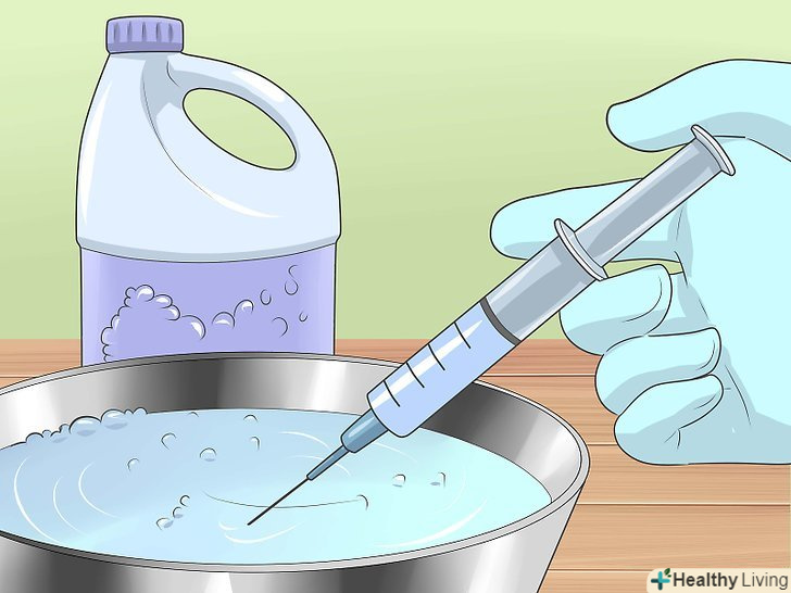 За допомогою хімічних речовин.голку також можна простерилізувати за допомогою хімікатів. Замочіть голку в розчині на 20 хвилин. Якщо ж для стерилізації ви взяли етиловий спирт, то голку в ньому потрібно замочити на 24 години.[13] голку можна промивати в наступних речовинах:- Відбілювач. Якщо концентрація хлору становить 5 %, його можна не розбавляти. Якщо концентрація становить 10 %, співвідношення води і відбілювача має бути 1:1. При концентрації в 15 % використовуйте 1 частина відбілювача і 2 частини води.[14]