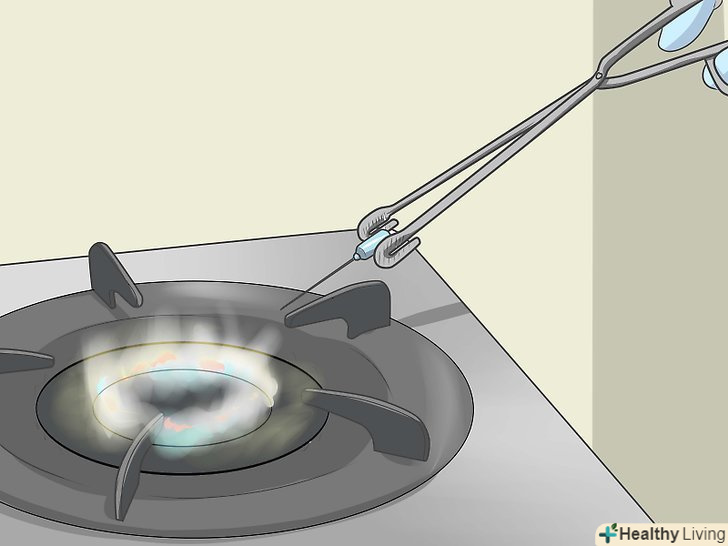 За допомогою вогню.використовуйте вогонь, джерелом якого є газ, оскільки в ньому менше домішок. Піднесіть кінець голки до вогню і почекайте, поки вона не розжариться (голка стане червоною).[9]- Стерилізація голки у вогні добре підходить для будинку, але вона все одно не буде повністю стерильною, оскільки на неї можуть потрапити забруднюючі частинки з повітря.[10]