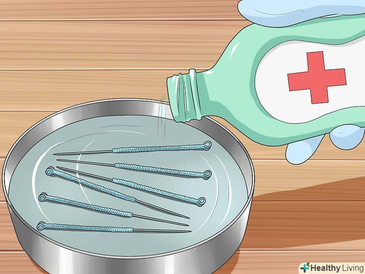 Сполосніть голку.промивши голку милом або дезінфікуючим засобом, сполосніть її стерильною водою. Вода обов'язково повинна бути стерильною, а не дистильованою. У дистильованій воді все ще можуть перебувати бактерії. Сполоснути голку необхідно для того, щоб на ній не залишилося мила або бруду.[3]