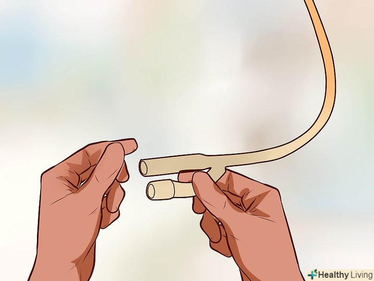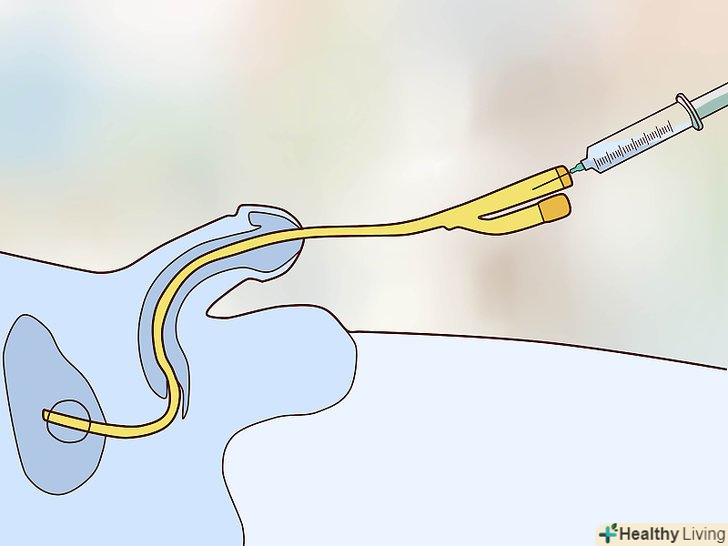 Якщо ви використовуєте катетер з манжетою, наповніть її стерильною водою.використовуйте шприц з водою для того, щоб наповнити катетер через стерильну трубку. Надута манжета служить якорем, який при русі не дасть катетеру зміститися. Після того як ви надули манжету, акуратно потягніть за катетер і переконайтеся, що він щільно сидить в шийці сечового міхура.[9]- Кількість води, використовуваної для наповнення манжети, залежить від її розміру — як правило, це 10 куб.см. води, але, краще перевірити розмір манжети.