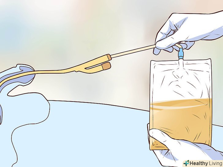 Приєднайте катетер до пакету для зливу.для зливу краще використовувати стерильну медичну трубку. Прикріпіть катетер до стегна або живота пацієнта лейкопластиром.- Переконайтеся, що мішок для зливу сечі знаходиться нижче сечового міхура пацієнта. Катетер працює за допомогою гравітації-сеча не може текти «вгору».
