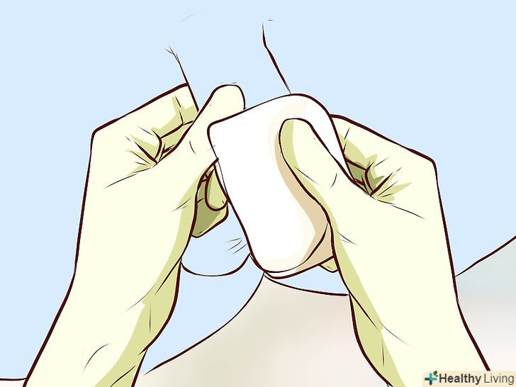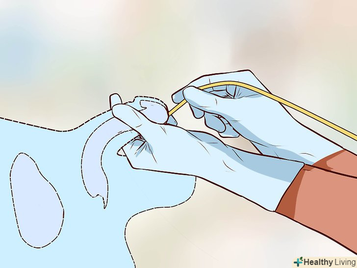 Стерилізують і приготуйте зону геніталій пацієнта.протріть генітальну зону пацієнта ватяними дисками, вимоченими в рідині для дезінфекції. Протріть або промийте зону геніталій стерильною водою або спиртом для видалення залишків забруднення. Якщо необхідно, повторіть. Після того як закінчите, розкладіть хірургічні серветки навколо геніталій, залишивши доступ до пеніса або піхви.[5]- У пацієнтів жіночої статі обов'язково протріть статеві губи і сечовипускальний канал (розташований у верхній частині над входом в піхву), а у чоловіків головку пеніса і також сечовипускальний канал.