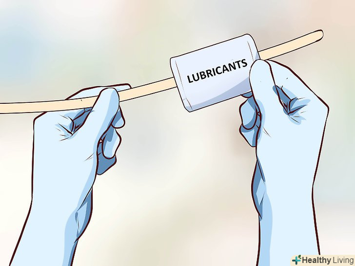 Обробіть кінчик катетера мастилом.покрийте віддалену частину кінчика катетера (2-5 см кінчика) великою кількістю мастила. Це і буде кінець, який ви введете в уретру пацієнта. Якщо використовуєте катетер з манжетою для повітря на кінці, обов'язково обробіть і її.[6]