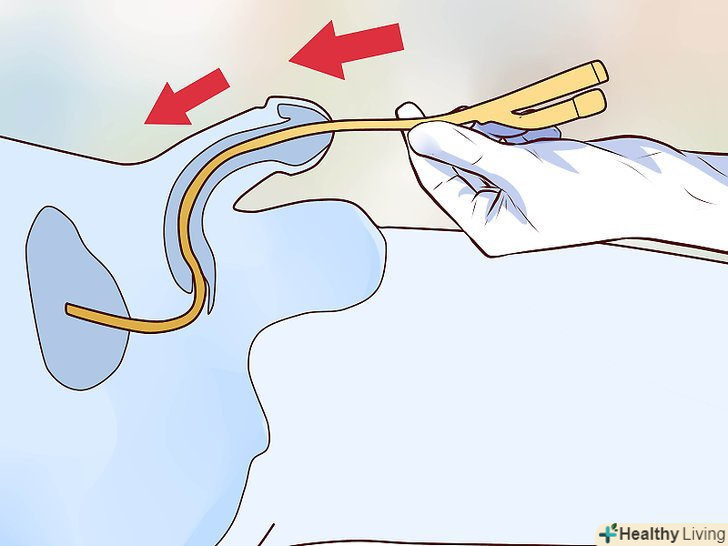 Якщо пацієнт чоловік, тримаючи пеніс, введіть катетер в отвір уретри.тримаючи пеніс в неведущей руці, відтягніть його перпендикулярно тілу пацієнта. Провідною рукою введіть катетер в уретру пацієнта.[8]