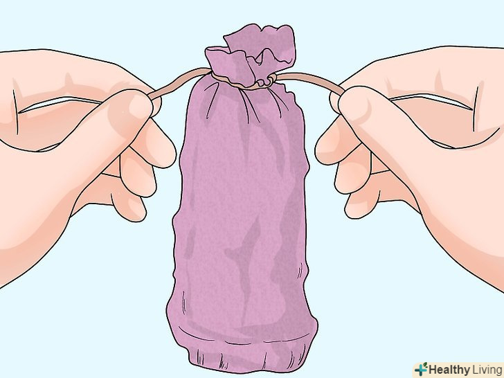 Запечатайте отвір носка.ви можете закрити його тимчасово або більш грунтовно, в залежності від того, наскільки довго ви збираєтеся використовувати компрес. Зав'язавши міцний вузол, ви запечатаєте компрес, і в той же час зможете розібрати його і знову використовувати носок за призначенням. Для більш довгого користування компресом отвір носка можна зашити.[5]- Врахуйте, що якщо ви зав'яжете або зашиєте носок впритул до його вмісту, компрес вийде досить тугим, якщо ж віддалік від наповнювача, він буде більш вільним і м'яким. Перед остаточним закриттям компресу трохи поекспериментуйте з ним, визначивши оптимальний варіант.