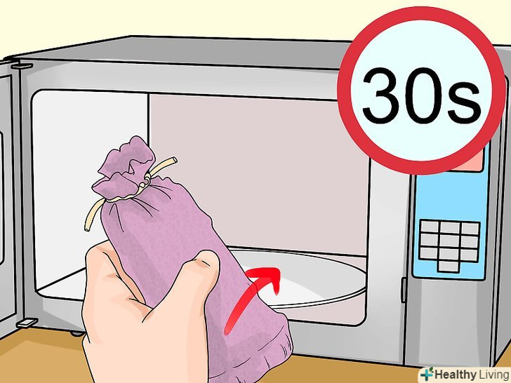 Помістіть компрес в мікрохвильову піч.Зав'язавши або зашивши носок, покладіть його на 30 секунд в мікрохвильову піч. Після 30 секунд відкрийте піч і помацайте компрес, перевіривши, наскільки він розігрівся. Якщо його температура підходить вам, вийміть і використовуйте його. Якщо ви хочете, щоб він був тепліше, продовжуйте розігрівати його в мікрохвильовій печі до необхідної температури, кожен раз додаючи по 10 секунд.[6]