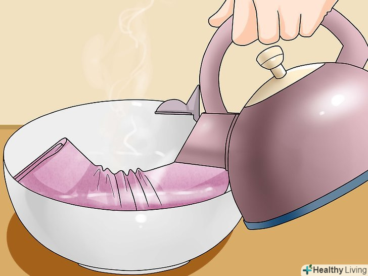 Можна використовувати також чайник.якщо у вас немає мікрохвильової печі або ви не хочете поміщати в неї пластиковий пакет, просто розігрійте невелику кількість води в чайнику. Покладіть мочалку в миску і залийте її гарячою водою. Потім за допомогою кухонних щипців перекладіть мокру мочалку в пластиковий пакет.- Якщо ви хочете зробити вологий теплий компрес, можна прикласти мокру мочалку безпосередньо до шкіри. Такий компрес корисний для зняття болю на місці свища. Перед прикладанням компресу упевніться, що він не дуже гарячий.[10]