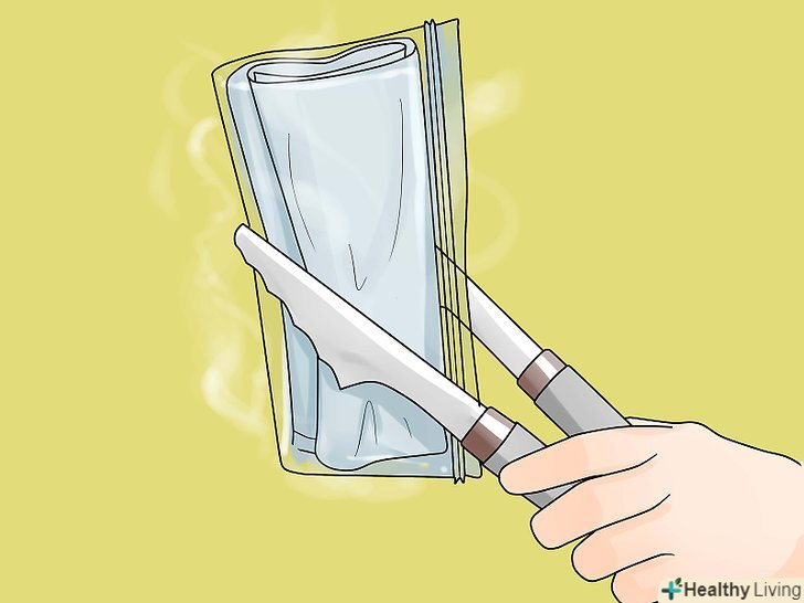 Будьте обережні при поводженні з пластиковим пакетом.оскільки мочалка була просякнута водою, з розігрітого пакета може виходити гаряча пара. Виймаючи пакет з мочалкою з мікрохвильової печі, будьте обережні, щоб не отримати опік-гаряча пара може обпалити вашу шкіру, навіть якщо ви не будете торкатися до розігрітого предмету.[11]- Якщо пакет і мочалка занадто гарячі, використовуйте кухонні щипці.