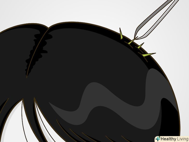 Видаліть великі голки за допомогою пінцета.якщо у вашому волоссі заплуталися великі і легко помітні кактусові голки, захопіть їх пінцетом і витягніть з волосся. Ці голки можуть супроводжувати дрібні голки, які дуже важко побачити, тому носіть садові рукавички, щоб захистити руки.[8]- Якщо деякі голки проткнули шкіру голови, попросіть кого-небудь перевірити, чи немає ознак пошкоджень. При виявленні таких ознак негайно зверніться до лікаря.