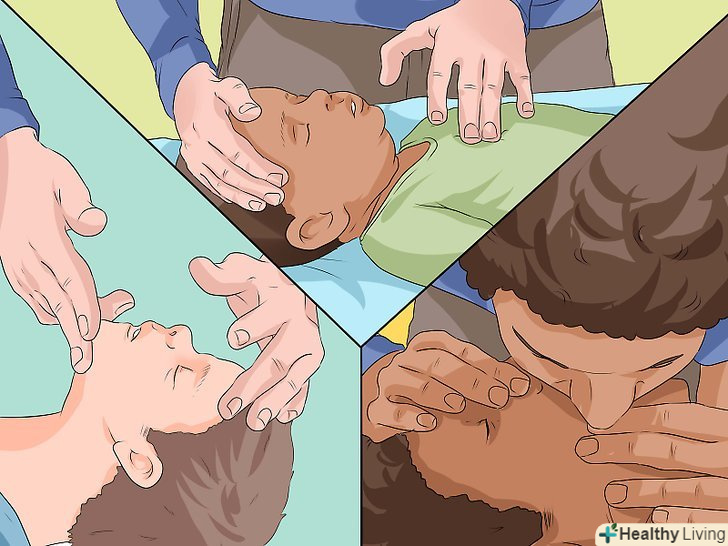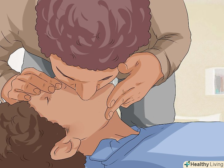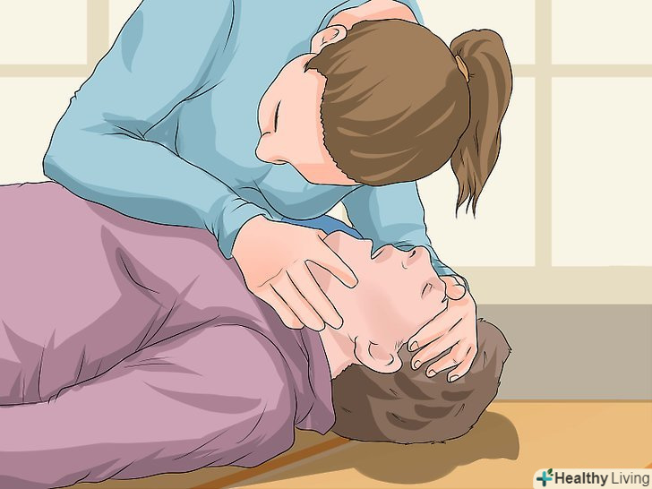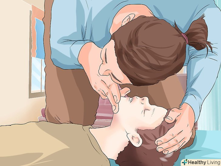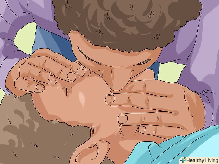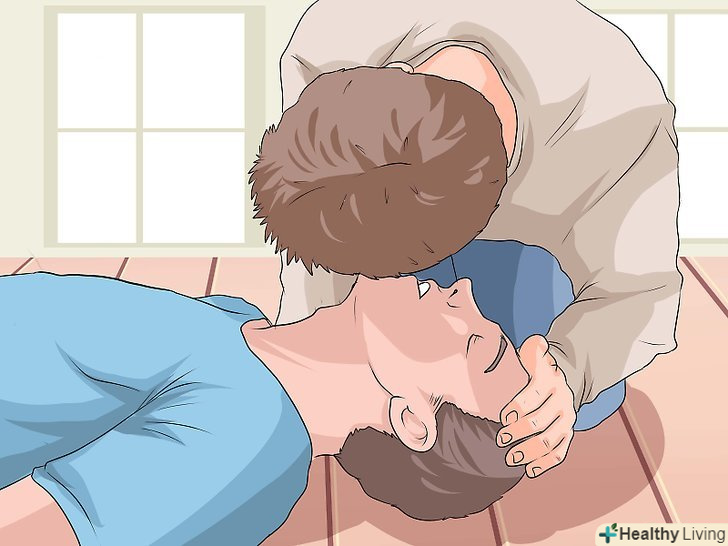 Виконайте штучне дихання, якщо вмієте. після тридцяти стиснень ви повинні зробити два вдиху (співвідношення 30:2[30]). Для цього ви можете виконати штучне дихання рот в рот або рот в ніс. При штучному диханні рот в рот, ви повинні будете закрити ніздрі людини.[31] щоб виконати штучне дихання дорослому, необхідно:[32]- Відкрийте рот і повністю обхопіть їм рот потерпілого.