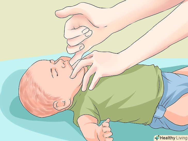 Перевірте дихальні шляхи.стиснення могли змістити предмет, що застряг в горлі немовляти. Після тридцяти стиснень Вам слід знову перевірити верхні дихальні шляхи немовляти. Нахиліть голову немовляти назад, піднявши підборіддя і при цьому натискаючи на його лоб іншою рукою. Відкрийте рот і подивіться, чи можете ви зараз витягнути предмет (тільки в тому випадку, якщо зробити це можна легко). Витратьте кілька секунд (не більше десяти), щоб перевірити дихання і поглянути на грудну клітку немовляти, і переконайтеся, що він здатний самостійно дихати.