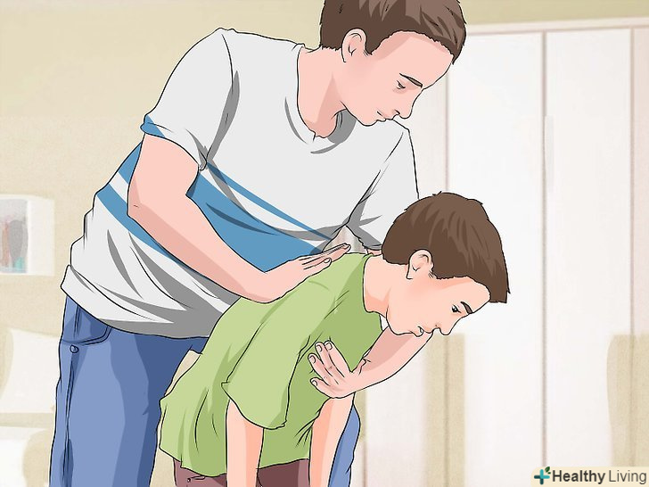 - Швидким поштовхом вгору втисніть кулак в живіт дитини. При необхідності повторіть прийом п'ять разів, поки дихальні шляхи не звільняться.