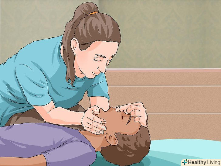 Виконайте штучне дихання, якщо вмієте.якщо дитина, яка знаходиться без свідомості, все ще не дихає, тоді вам варто почати робити штучне дихання. Для цього ви можете виконати штучне дихання рот в рот або рот в ніс.[19] при штучному диханні рот в рот ви повинні будете закрити ніздрі дитини. Щоб виконати штучне дихання дитині, необхідно:[20]- Відкрийте рот і повністю обхопіть їм рот дитини.