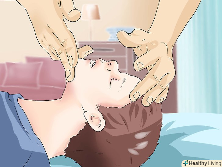 Перевірте дихальні шляхи.стиснення могли змістити предмет, що застряг в горлі у потерпілого. Після тридцяти стиснень Вам слід знову перевірити верхні дихальні шляхи. Нахиліть його голову назад, піднявши підборіддя і при цьому натискаючи на його лоб іншою рукою.[28] відкрийте рот і подивіться, чи можете ви зараз видалити предмет (тільки в тому випадку, якщо зробити це можна легко). Витратьте кілька секунд (не більше десяти), щоб перевірити дихання і поглянути на грудну клітку людини, і переконайтеся, що він здатний самостійно дихати.[29]