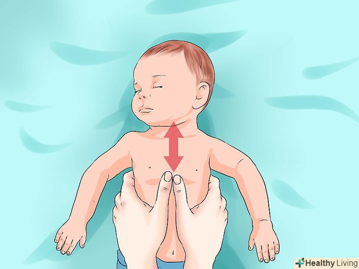 - Натисніть пальцями, щоб стиснути грудну клітку немовляти приблизно на чотири сантиметри. Частота повинна бути дорівнює 100 стисненням в хвилину. Головне, переконайтеся, щоб після натискання грудна клітка немовляти піднялася назад.