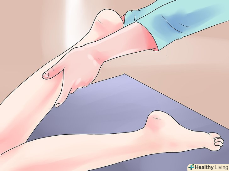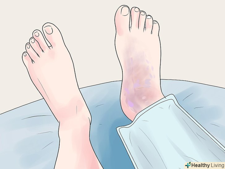 Прийміть знеболюючий препарат.щоб вгамувати біль, прийміть парацетамол.[5] не приймайте ібупрофен або ацетилсаліцилову кислоту (аспірин), так як вони погіршують згортання крові і продовжують кровотечу.- Вдайтеся до RICE-лікування, щоб прискорити загоєння гематоми. RICE — акронім, застосовуваний при лікуванні травм: Rest — відпочинок, Ice — лід, Compression — стиснення, Elevation-підняття. Не навантажуйте пошкоджену кінцівку і прикладайте до гематоми компреси з льодом протягом 48 годин після травми, щоб зменшити запалення. Коли не прикладаєте компрес, накладайте на місце травми компресійну пов'язку, щоб не порушити циркуляцію крові. Набряк можна зменшити, тримаючи кінцівку над рівнем серця — наприклад, можна лежати, а під пошкоджену ділянку підкладати подушку.[6]