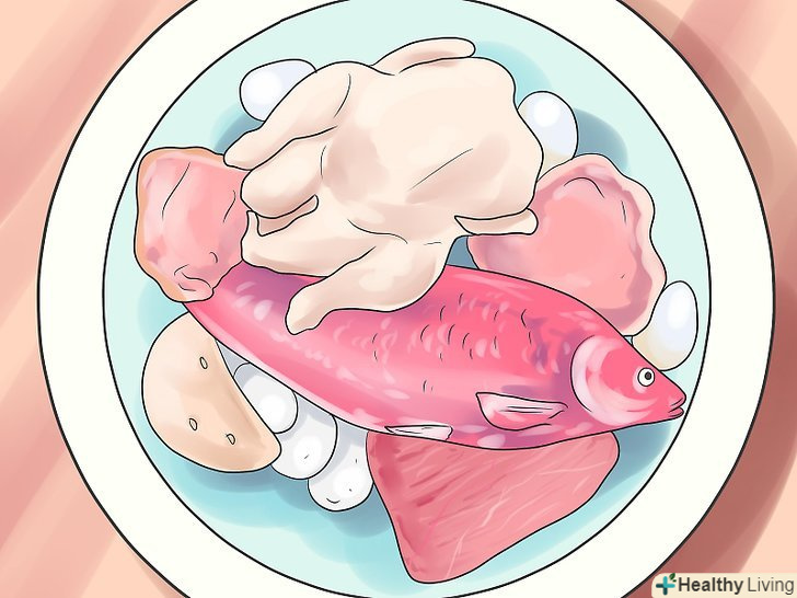 Споживайте достатню кількість вітаміну B12.дефіцит цієї речовини сприяє утворенню гематом, розвитку анемії і негативно впливає на згортання крові.[8] у групі ризику знаходяться вегетаріанці, оскільки рослини не містять вітамін B12. Якщо ви не їсте м'ясо, приймайте цей вітамін в таблетках.- Вітамін B12 є у великій кількості білкових продуктів, включаючи м'ясо внутрішніх органів (яловича печінка), молюсків, м'ясо птиці, яйця, молоко і молочні продукти, деякі пластівці і каші.