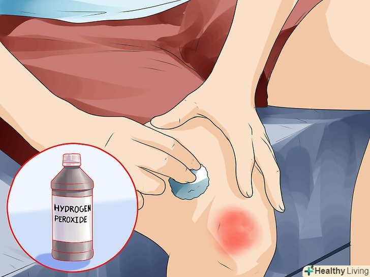 Продезінфікуйте рану.обробіть рану спиртом, йодом або перекисом водню, якщо є ознаки бруду на садні або якщо є кровотеча. Намочіть ватний тампон в спирті, йоді або перекису, а потім ретельно промакніте їм опік. Ця процедура може бути болючою. [2]- Використання спирту може завдати шкоди і викликати неприємні відчуття, тому застосовуйте його тільки в крайніх випадках.[3]