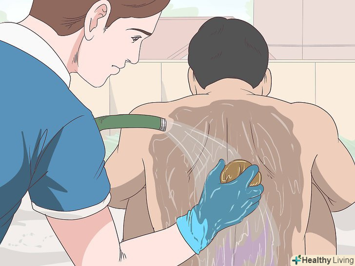 Надайте невідкладну допомогу при попаданні отрути на шкіру. якщо ви припускаєте, що на шкіру людини потрапили отруйні або небезпечні речовини, перш за все зніміть з потерпілого забруднений одяг. Найкраще робити це в нітрилових медичних рукавичках, які стійкі до більшості побутових хімікатів, але можна використовувати і будь-які інші, які зможуть надійно захистити ваші руки. Промивайте шкіру прохолодною або теплою водою під душем або з шланга протягом 15-20 хвилин. [18] [19]- У цьому випадку також дуже важливо з'ясувати, який саме отрута потрапила на шкіру. Медикам необхідно точно знати, чи була це луг, кислота або інша речовина. Це дозволить їм оцінити, наскільки серйозно пошкодження шкіри, як його зупинити і як діяти при наданні допомоги.