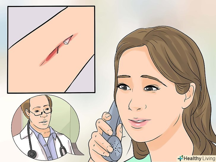 Перевірте, чи немає в рані стороннього предмета. Якщо в рані залишився чужорідний предмет, дуже важливо негайно звернутися до медиків. [3] в такому випадку існує ризик занесення інфекції в рану, а також висока ймовірність того, що вам буде потрібно накладення швів.- Не намагайтеся самостійно витягти чужорідний предмет з рани. Часом чужорідний предмет в рані перекриває собою ще більш сильна кровотеча, тому краще буде, якщо Витяг стороннього предмета з рани займеться лікар. [4]