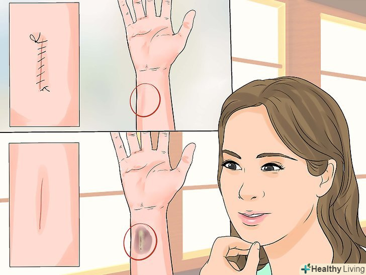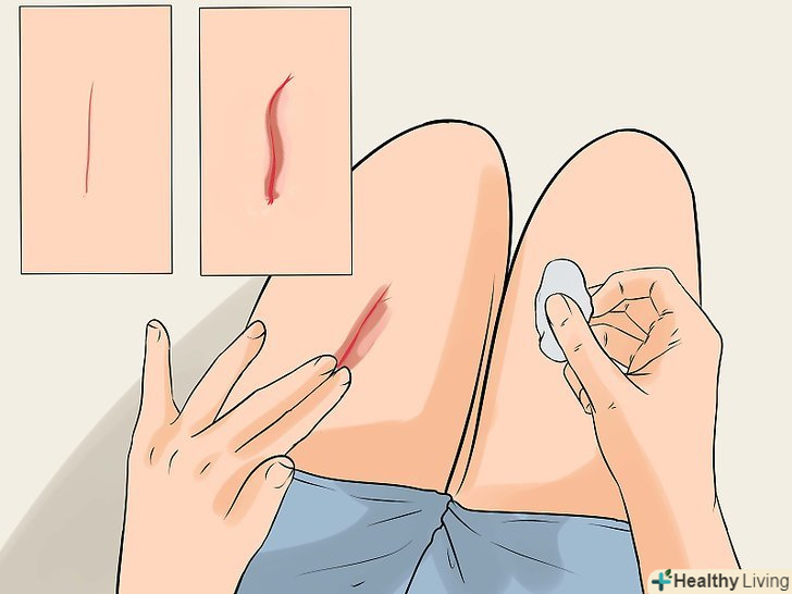 Оцініть ширину рани. зімкнуті чи краю рани, або їх потрібно стягувати, щоб звести разом? Якщо рану потрібно стягувати, щоб закрити травмовані внутрішні тканини, то це служить ознакою необхідності накладення швів. Стежки накладеного на поріз шва дозволять краях рани стикатися, що прискорить її загоєння. [9]