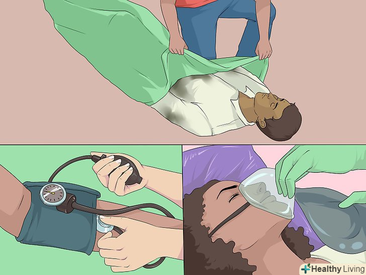 Запобігайте шоку. розмістіть отримав опік людини так, щоб запобігти шок: покладіть його і підніміть ноги і місце опіку над рівнем серця, якщо це можливо. Підкладіть будь-які підручні предмети, щоб потерпілий залишався в такій позі, і накрийте його курткою або ковдрою. [4]- Не рухайте потерпілого, якщо у нього є пошкодження в області голови, шиї або хребта, якщо тільки ви не пройшли курси першої допомоги і володієте необхідними навичками. Неправильне переміщення при таких травмах може привести до незворотного пошкодження тіла або мозку.