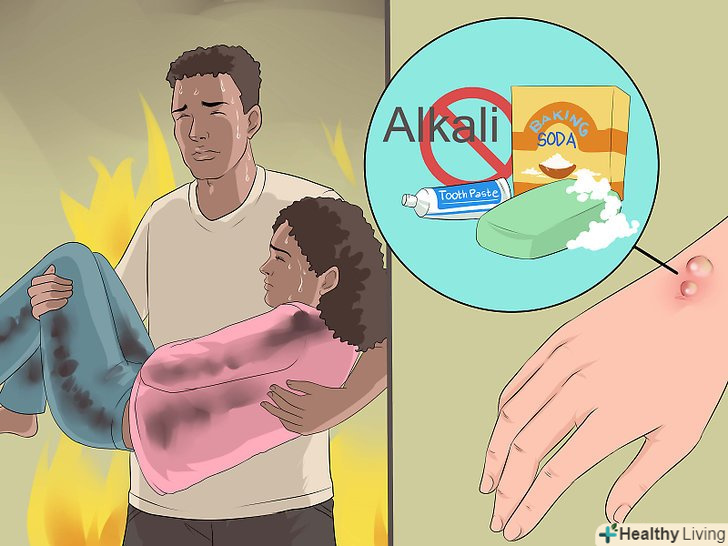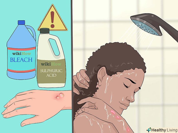 Надайте першу допомогу при хімічному опіку. як правило, найкраще відразу видалити потерпілого з ураженої зони і зняти з нього забруднений одяг. Потім необхідно як слід промити уражене місце свіжою проточною водою, щоб розвести потрапила на шкіру небезпечна речовина. Промивайте місце опіку протягом хоча б 20 хвилин. [9]- Хімічні опіки можуть викликати найрізноманітніші речовини, в тому числі побутові чистячі засоби, наприклад містять сірчану кислоту розчини для прочищення труб, холодоагенти з плавиковою кислотою або відбілювач. [10]