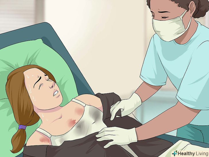 Дістаньтеся до лікарні. Машина швидкої допомоги повинна доставити потерпілого в найближчу лікарню, де лікарі відразу ж приступлять до лікування опіку та інших пошкоджень і при необхідності поставлять крапельницю і забезпечать пацієнта додатковим киснем. [8]- Поки потерпілий знаходиться в лікарні, дізнайтеся у лікаря про те, як продовжувати лікування і коли слід відвідати його в наступний раз. Наприклад, можна задати наступні питання: «як необхідно доглядати за місцем опіку, щоб воно повністю зажило?", "Коли слід відвідати лікаря, щоб він оглянув потерпілого?»