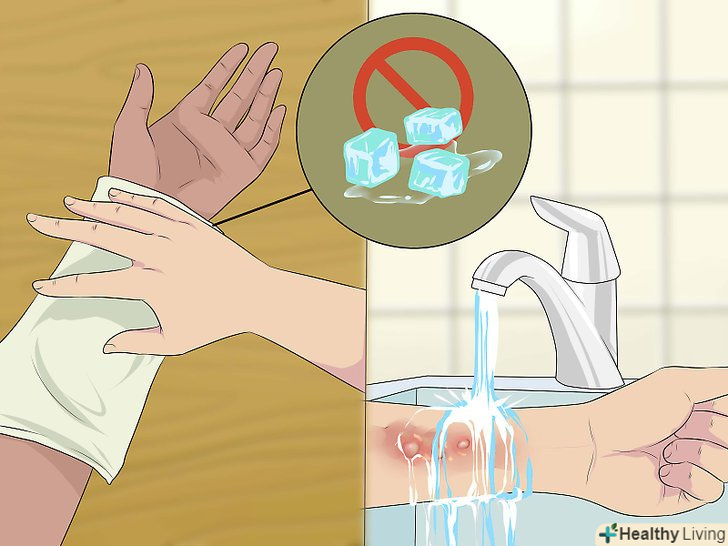 Охолодіть шкіру. використовуйте для цього прохолодну воду або компрес. Не прикладайте до місця опіку крижану воду, так як це може привести до того, що приплив крові утрудниться, а травма посилиться.- Якщо є така можливість, потримайте обпалене місце під чистою проточною водою аж до 20 хвилин. Якщо у вас немає доступу до проточної води, можна опустити пошкоджене місце в миску або ванну з холодною водою.