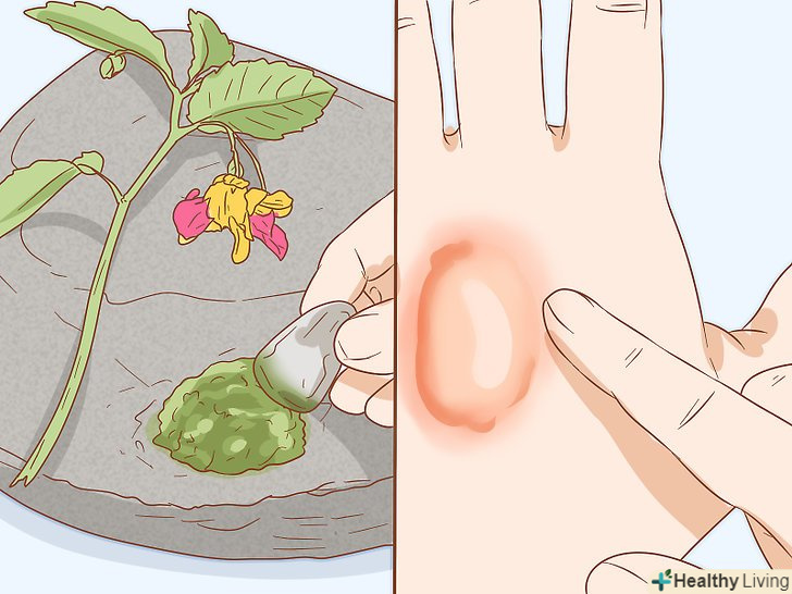 Якщо ви перебуваєте на природі, розітріть бальзамін двоколірний. ця рослина допомагає при контакті з отруйним плющем. Бальзамін-це кущ з великою кількістю листя, які ростуть низько над землею, з жовтими і помаранчевими квітками у формі дзвіночка. Розітріть бальзамін, щоб вийшла кашка, і нанесіть на висип. Дайте висохнути, а потім змийте холодною водою.- Бальзамін нейтралізує масло, що міститься в отруйному плющі. Ця рослина може запобігти появі висипу або зменшити її прояви.