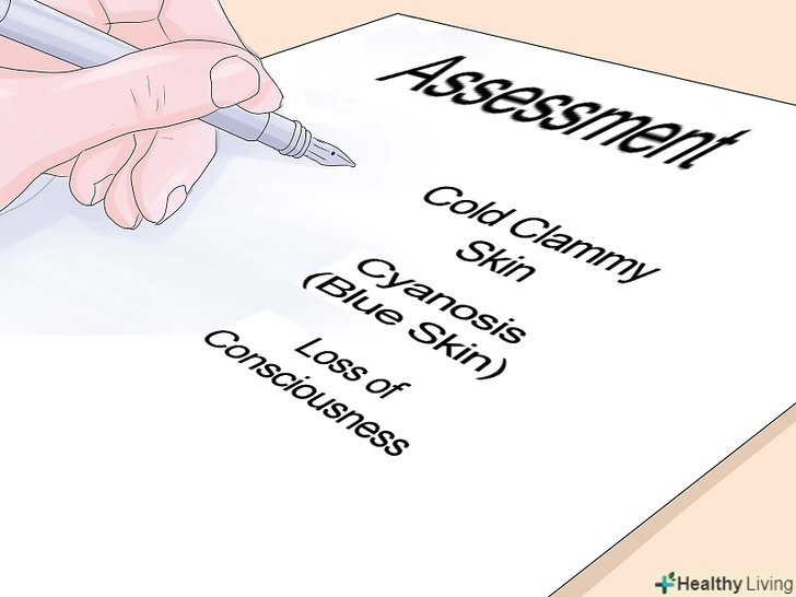 Огляньте вашого пацієнта на предмет знаходження в шоці. у зв'язку з тим, що накладення джгута потрібно при серйозних травмах, ваш пацієнт може перебувати в стані гіповолемічного шоку. Це невідкладний стан настає в зв'язку з рясною втратою крові, при якому серце не в змозі перекачувати достатню її кількість по організму. Цей стан може привести до відмов різних органів. Огляньте вашого пацієнта і зверніть увагу на наступні симптоми гіповолемічного шоку:- Холодна, пітна шкіра