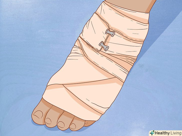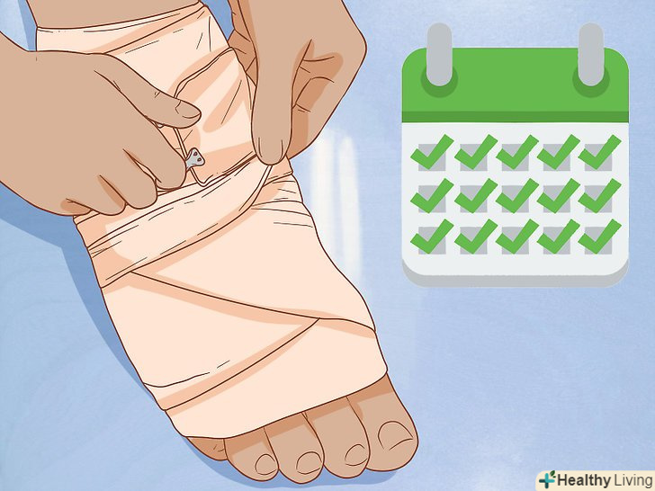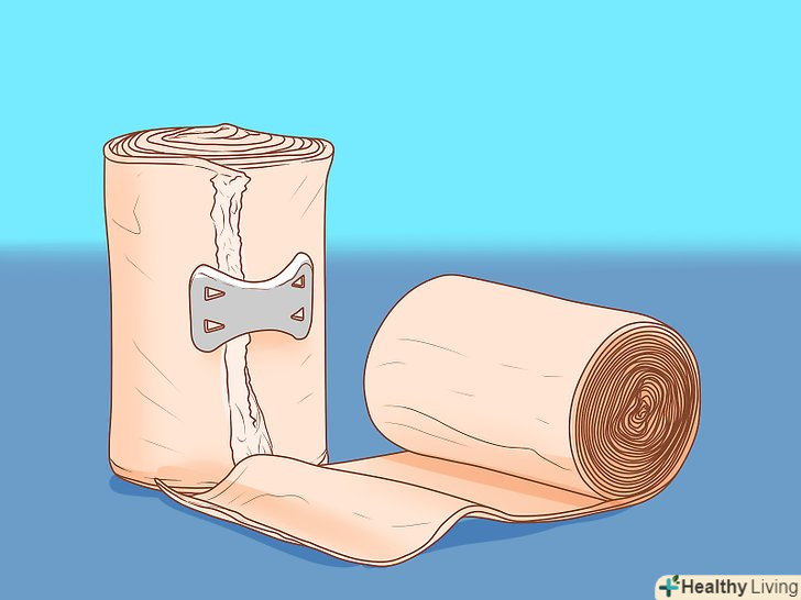 Закріпіть пов'язку. після накладення еластичної пов'язки необхідно її закріпити. Це можна зробити кількома способами. Ви можете використовувати лейкопластир або спеціальні скріпки для закріплення еластичної пов'язки в потрібному місці. Перед фіксацією пов'язки необхідно переконатися в тому, що вона не дуже туго прилягає до рани. [10]
