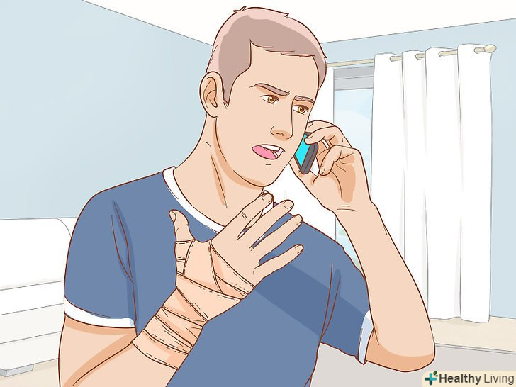 Дізнайтеся, в яких випадках необхідно звернутися за медичною допомогою. Перев'язку незначних пошкоджень можна проводити в домашніх умовах, однак при наявності серйозних травм необхідно перев'язати її пов'язкою в якості захисту рани від зовнішніх впливів до звернення до лікаря. Зателефонуйте на гарячу лінію і попросіть поради у медсестри, якщо ви не впевнені, чи відноситься ваша рана до серйозних пошкоджень. [14]- Якщо ви перев'язали рану, але вона не заживає або викликає сильний біль через 24 години, слід негайно звернутися за допомогою до лікаря.