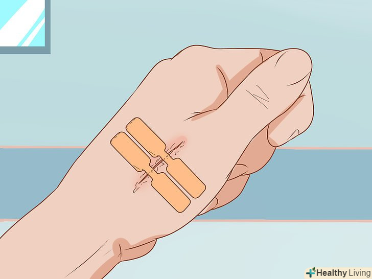 Використовуйте пластир-метелика для порізів і невеликих ран. пластир-метелик являє собою дві липкі лейкопластирні смужки, з'єднані тонкої не липкою прошарком пов'язки. Цей вид пов'язки використовується для закритих ран, а не для зупинки кровотечі або запобігання інфекції. Ви можете використовувати таку пов'язку-метелика, якщо у вас «рваний» поріз або невелика рана. Зніміть плівку з задньої сторони і помістіть пов'язку клейкими кінцями по обидві сторони порізу. Потім притисніть кінці, повністю закриваючи рану. Неклейкая Центральна смужка повинна знаходитися безпосередньо над раною. [18]- Відрізок стерильної марлі кріпиться за допомогою стрічки і повинен бути розміщений поверх пов'язки-метелика принаймні в перші 24 години, що допоможе запобігти появі інфекції.