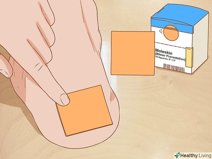 Використовуйте Молескін для перев'язки пухирів. Молескін є особливим видом пінистих клейких пов'язок, який використовується для запобігання пошкодження пухирів. Молескін зазвичай має форму пончика з вирізом посередині для накладення пов'язки на пухир. Зніміть задню плівку по всьому колу молескіна і прикладіть його до пухиря, щоб пухир знаходився в круглому отворі на пов'язці. Це запобіжить пошкодження і зніме тиск на нього. Ви можете накласти вузьку пов'язку поверх молескина для запобігання інфекції на випадок можливого розриву пухиря.- Ви можете зробити саморобний Молескін, уклавши кілька шарів марлі на висоту трохи вище рівня пухиря і виконавши в центрі отвір більше його ширини. Розташуйте пухир по центру отвору, а потім накрийте шматком марлі і надійно закріпіть лейкопластиром.