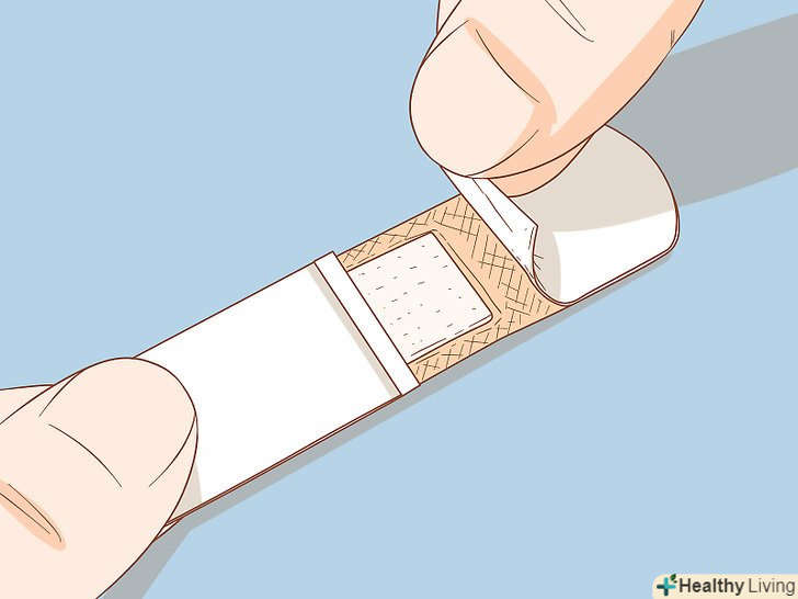 Зніміть обгортку. більшість вузьких пов'язок, зроблених з еластичного або тканинного лейкопластирного матеріалу поверх невеликого відрізка марлевої прокладки, продаються в окремих упаковках. Перед накладенням необхідно зняти обгортку з пов'язки разом із захисною плівкою на клейкою її стороні. [2]