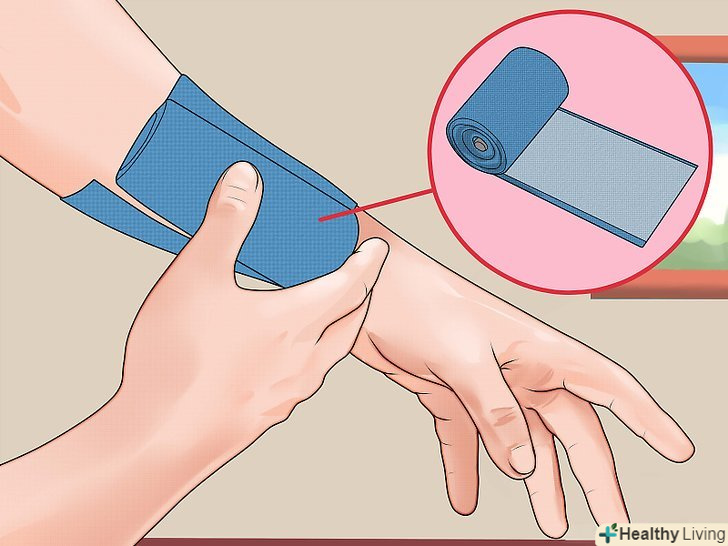 Натисніть на рану, якщо кровотеча не зупиняється. якщо через хвилину-дві кровотеча не зупинилося, натисніть на рану. Покладіть на поріз чисту тканину або стерильний бинт. Покладіть руку на бинт і протягом 15 хвилин злегка натискайте на рану. Якщо бинт наскрізь промокне, не прибирайте його. Замість цього покладіть другий бинт поверх першого. [7]- Якщо на ваших руках немає рукавичок або іншого засобу захисту, попросіть потерпілого натиснути на свою рану, поклавши руки поверх перев'язувального матеріалу.