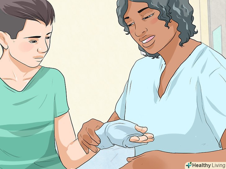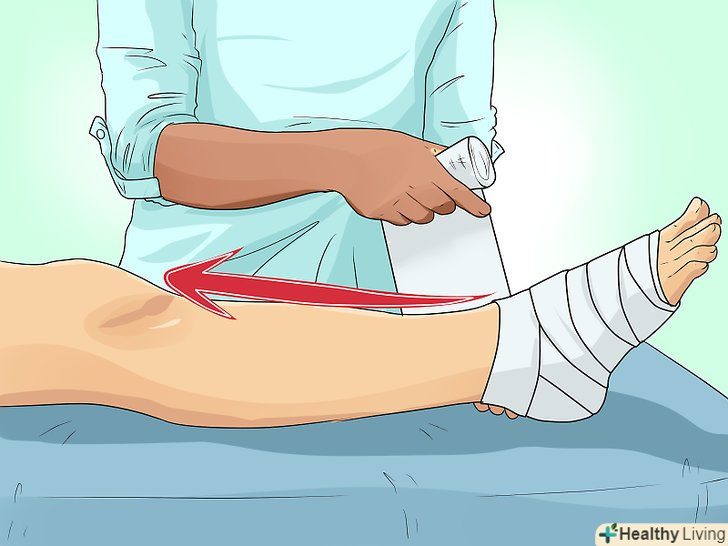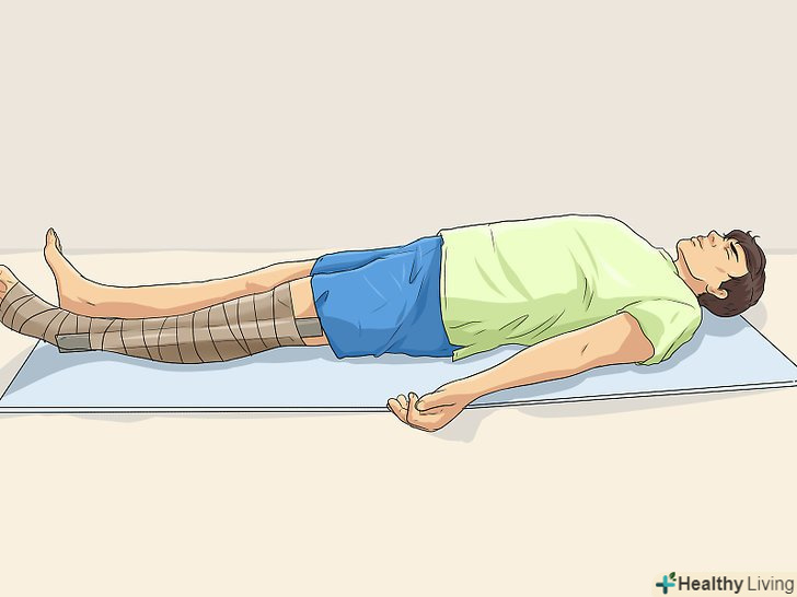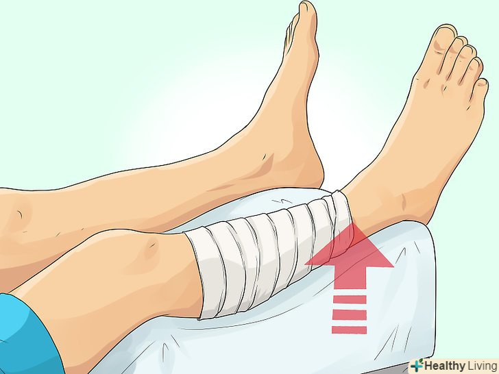Підніміть пошкоджену кінцівку. необхідно підняти її так, щоб вона розташовувалася вище рівня серця потерпілого. У разі переломів піднімайте кінцівку лише після того, як накладіть шину на пошкоджені кістки. [12]- Піднявши ногу, покладіть її ступнею або щиколоткою на який-небудь тюк, колоду, камінь або інший подібний предмет; це можна зробити, якщо потерпілий лежить або сидить. Пошкоджену руку, зігнувши в лікті, можна покласти на груди, якщо поранений лежить на спині, або помістити зап'ястям на голову, якщо він сидить. [13]