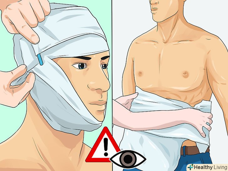 - Не прикладайте тиск до рани на голові в тому випадку, якщо череп потерпілого здається деформованим. Придивіться, чи немає вм'ятин, видимих фрагментів кісток або виступили тканин мозку. Не прикладайте тиск до рани, якщо вона зачіпає око, або якщо в ній знаходиться сторонній об'єкт, мабуть проткнув череп. В цьому випадку обережно прикрийте рану бинтом або чистою тканиною, укладіть потерпілого і постарайтеся якомога швидше викликати невідкладну медичну допомогу. Якщо тампон просочиться кров'ю, додайте поверх нього додатковий шматок бинта або тканини. [28]