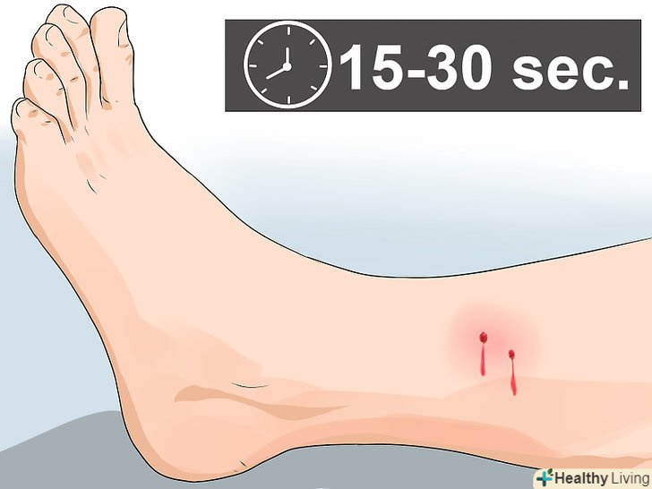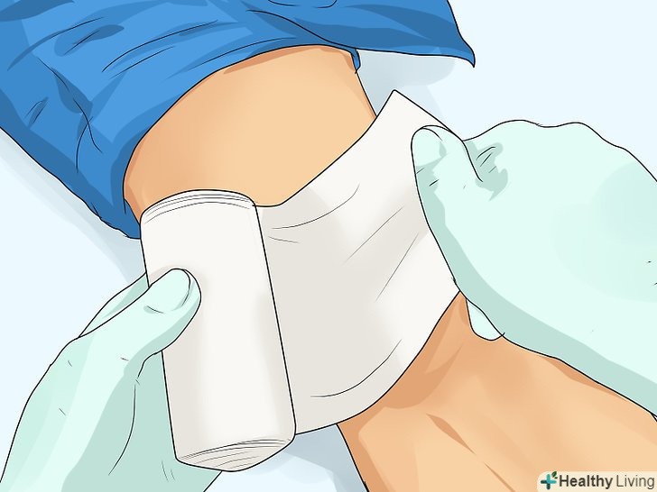 Натисніть на рану рукою. поклавши долоню на пов'язку, натисніть через неї на рану. Притискайте пов'язку до рани протягом 5-10 хвилин. Після цього ще раз перевірте, чи немає ознак сильної кровотечі, таких як наскрізь просочилася кров'ю тканину пов'язки або випливає з-під неї кров. [15]