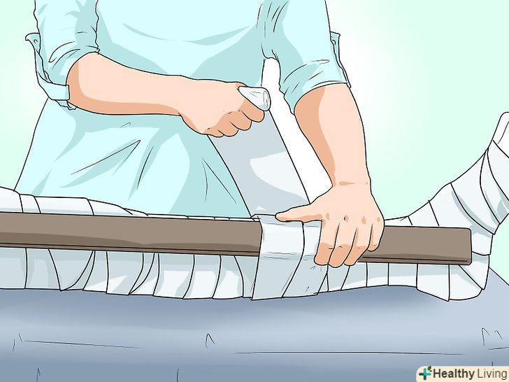 - Накладіть на пошкоджену кінцівку шину. Для цього вам будуть потрібні прямі жорсткі предмети (дошки, лист пластика або картону) і перев'язувальний матеріал (смужки одягу або мотузки). Спочатку покладіть перев'язувальний матеріал на відповідний жорсткий предмет, щоб уникнути інфекції. Потім приставте цей предмет до кінцівки, зафіксувавши її так, щоб пошкоджені суглоби знаходилися в випрямленому положенні. Не затягуйте смужки тканини або мотузки занадто туго, щоб не утруднити кровообіг. [14]
