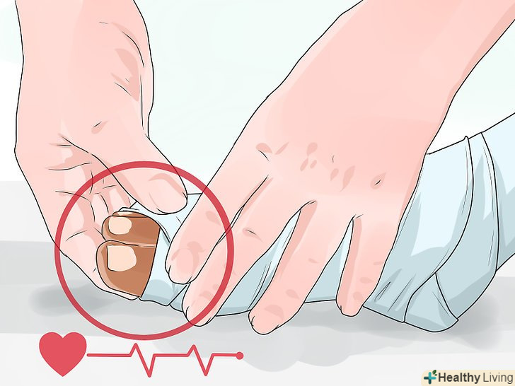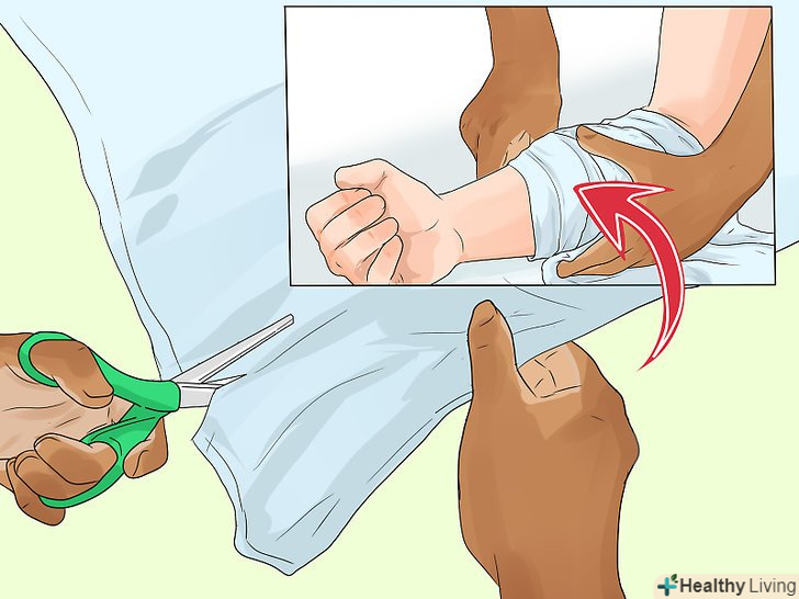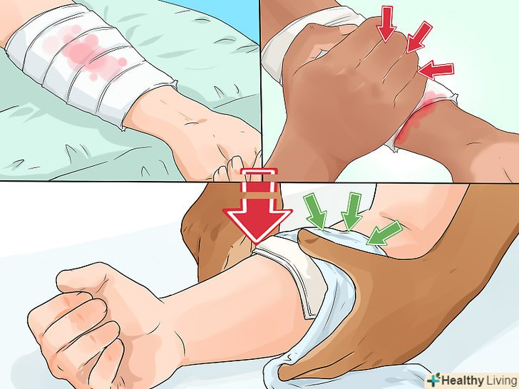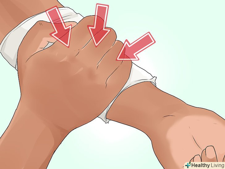 Перевірте пульс у перев'язаній кінцівці. якщо пульс не прощупується, це означає, що пов'язка затягнута занадто туго, і слід послабити її. Якщо пульс слабшає, пов'язка занадто вільна − в цьому випадку злегка підтягніть її. [47] необхідно, щоб пульс був нормальним і добре промацувався.- Якщо пов'язка накладена на ногу, перевіряйте пульс на верхній стороні ступні. При перев'язці руки перевіряйте пульс на внутрішній стороні зап'ястя біля основи великого пальця. [48]