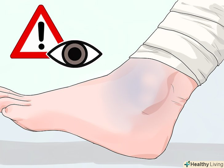 Закріпивши тампон, перевірте, чи не з'явилися на перев'язаної кінцівки ознаки ішемії. переконайтеся в тому, що вона не посиніла і не похолоділа. Така перевірка вкрай важлива в тому випадку, якщо ви перев'язуєте кінцівку смужкою тканини. [10]- Якщо ви виявите ознаки того, що в перев'язану кінцівку надходить недостатньо кисню, або не зможете намацати в ній пульс, злегка послабте пов'язку. Перевірте пульс нижче пов'язки. Для цього прикладіть свої пальці до зап'ястя біля основи великого пальця (при перев'язці руки) або на верхню сторону стопи біля щиколотки (при перев'язці ноги). [11]