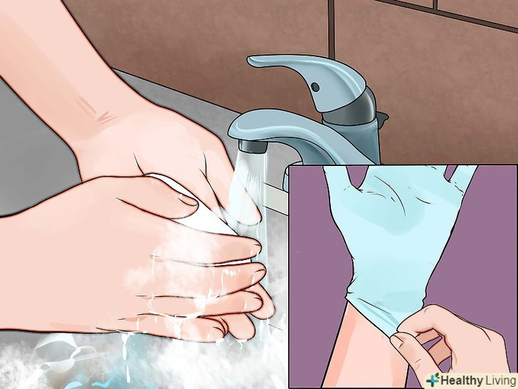 Дезінфікуйте рану, якщо це можливо. промокніть дезінфікуючим засобом саму область рани. Обов'язково надягайте рукавички, щоб захистити себе і потерпілого від інфекцій, що передаються через кров. Не витрачайте занадто багато життєво важливого часу на очищення рани – це момент первинної пов'язки, надання першої допомоги і потрібно встигнути зробити все найважливіше, щоб врятувати життя.- Прийміть запобіжні заходи, про які знаєте (або здогадуєтеся). не намагайтеся очистити рану перекисом; якщо це велика рана, спирт спровокує сильні болі, краще продезінфікуйте рану стерильною водою. Можливо, інша людина зможе застосувати антисептики, наприклад, спиртові тампони для очищення області Навколо рани, тільки потрібно діяти дуже швидко, ніби працюєте в команді. Поки ще не потрібно накладати джгут.